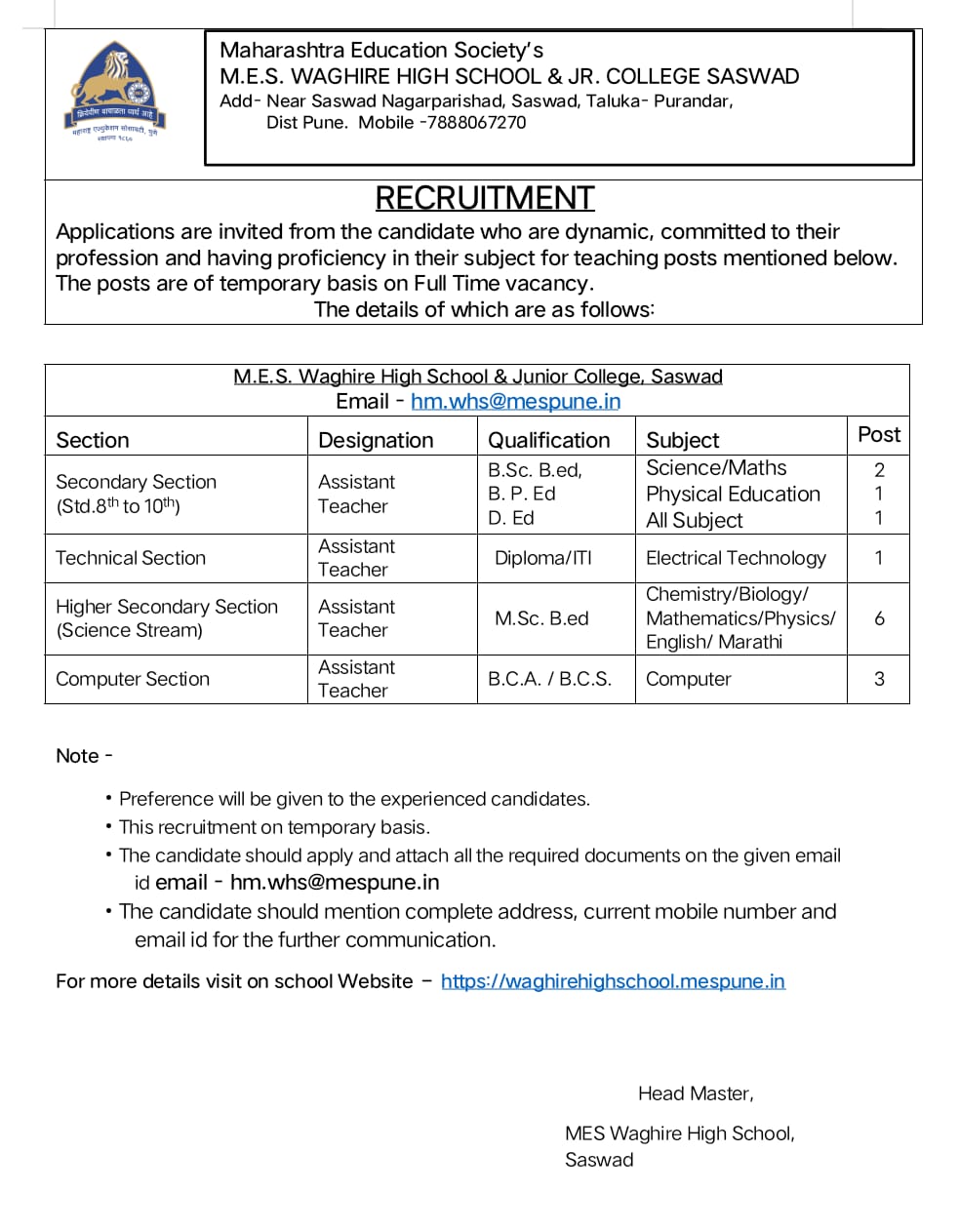 Recruitment (Teaching and Non-teaching staff) for the Academic Year 2026-27